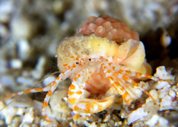 鮮やかなオレンジ色のシマシマ模様がとってもステキなヤドカリさんです。